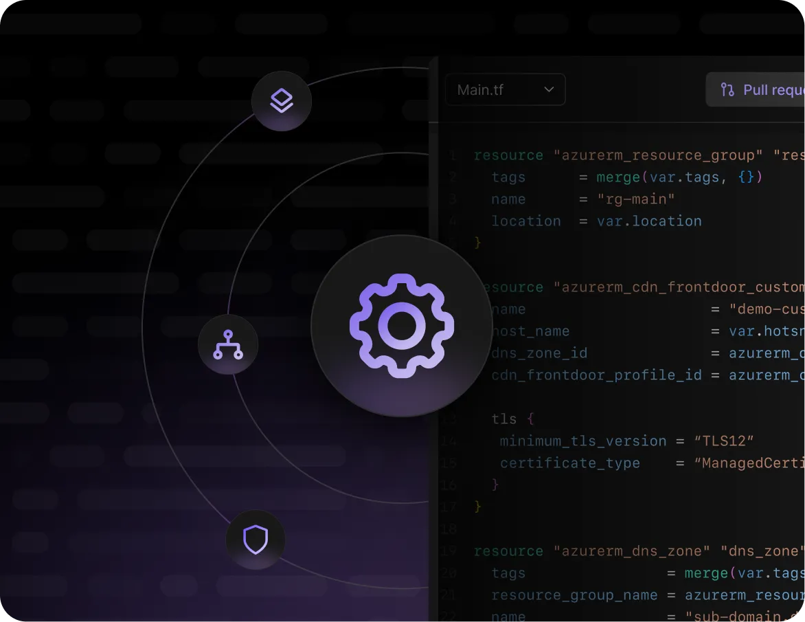 AI prompts offer accurate values and configuration patterns right in the interface - no need to switch to documentation. Built-in validations catch errors before deployment: misconfigurations, security gaps, and policy violations are detected and fixed cheaply. CI/CD integration works out of the box - plan, review, approve, and apply without having to set it up from scratch. A drag-and-drop UI backed by version-controlled Terraform lets even engineers without IaC experience automatically create correct, maintainable code.